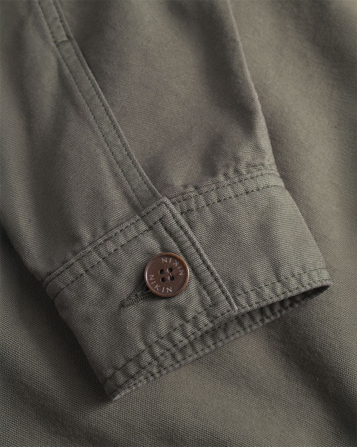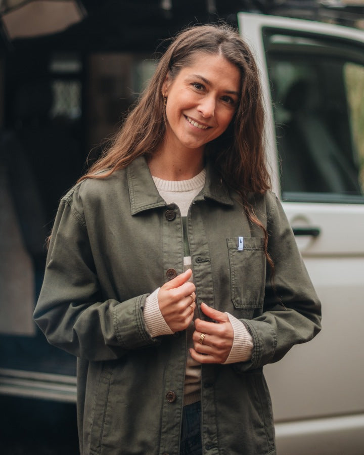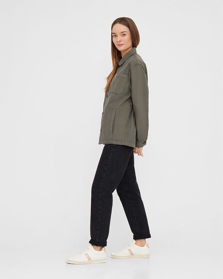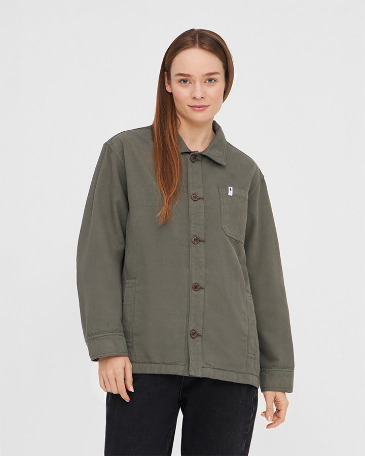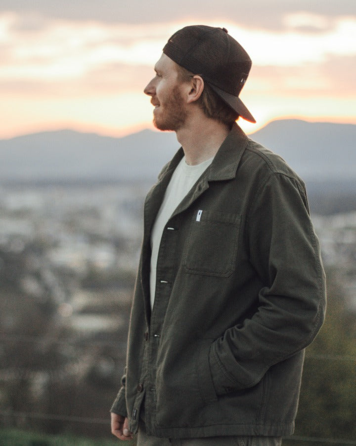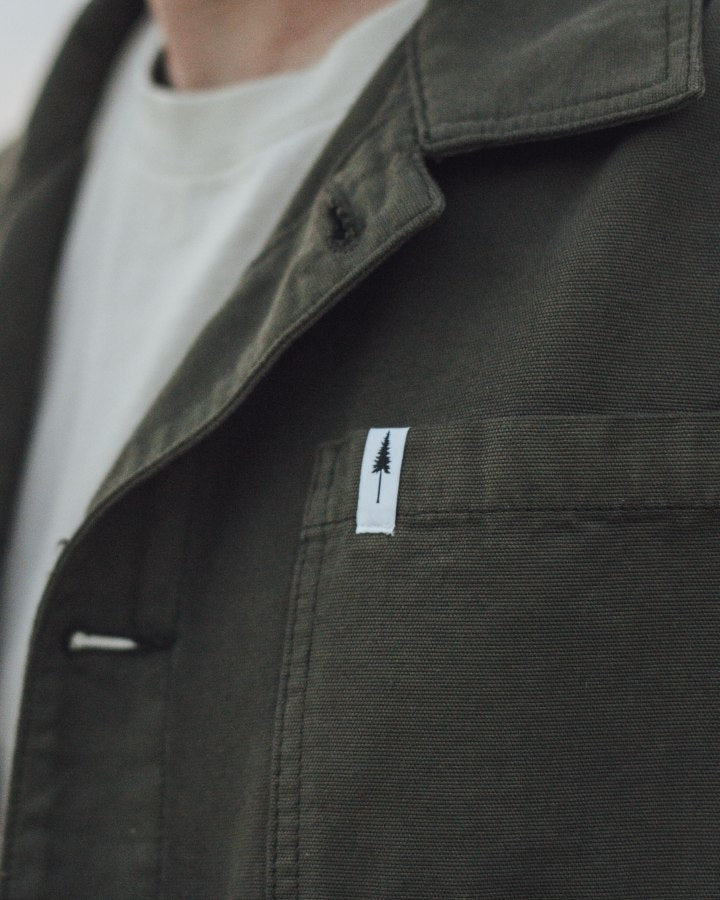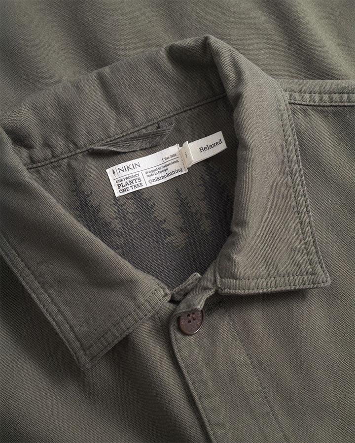 The TreeJacket Workwear Relaxed in Grape Leaf is a stylish cotton jacket with a casual relaxed fit. Made from 100% organic cotton, it features high-quality details such as a chest pocket, two side pockets and a subtle "Forest" print on the inside. The pre-washed jacket is sustainably produced in Europe and offers optimum comfort, functionality and a modern design for a relaxed look.